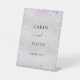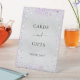 Un fondo metálico plateado falso. Decorado con purpurina morada falsa. Con el texto: Tarjetas y regalos. ¡Gracias!