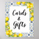 Señal de tarjetas y regalos de limón sobre baldosas azules