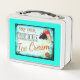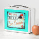 Diseño basado en un cartel de heladería vintage. Los colores son azul, turquesa, blanco y negro. Viene con helados completos y dice "Prueba nuestro delicioso helado".