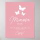 Nuestro cartel de despedida de soltera con barra de mimosa de mariposas rosadas con un bonito fondo rosa suave y caligrafía en letra script blanca, complementado con mariposas en un estilo simple y limpio, es perfecto para mostrar tu barra de mimosa e invitar a tus invitados a preparar una deliciosa bebida para un brindis.