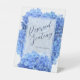 Letrero de asientos de recepción de boda para una mesa reservada. Hermosas flores de hortensias realistas rodean el texto oscuro azul. El texto de ejemplo es para "Asientos Reservados" o cambiar a "mesa reservada" u otro texto que se ajuste. La base del pedestal viene en cuatro tamaños con texto opcional más pequeño para indicar para quién se reserva la mesa.