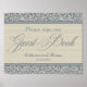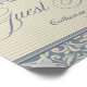 Una señal elegante para la mesa del libro de visitas de tu boda que presenta un hermoso patrón de damasco azul y beige con texto en letra de caligrafía y tus datos personalizados.
