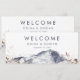 Este sencillo cabezal de bienvenida de la tabla de asientos colgantes de la montaña es perfecto para un boda al aire libre. El moderno diseño minimalista cuenta con una montaña acuática azul marino con flores silvestres de otoño rosadas. La tarjeta se imprime en la parte delantera y trasera (doble cara). Compruebe la colección para las tarjetas de la tabla de asignación de asientos de número de tabla de coordinación.