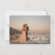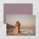 Agradecimiento de boda minimalista con foto que presenta una sola foto grande en la parte delantera con nombres y fecha de la boda y su mensaje único y firmas en la parte trasera. Cuenta con un fondo de lavanda polvoriento en la parte trasera. Marcador de posición de foto de plantilla cortesía de Unsplash. Diseño de Holiday Hearts Designs.