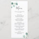 Elegante menú de bodas con un diseño sencillo con una vegetación de eucaliptos pintados en la esquina superior izquierda y en la esquina inferior derecha. El reverso es un color verde salado medio a juego. Este rústico menú botánico boda con un toque moderno es perfecto para un boda primaveral o de verano.