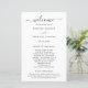 Sencillo programa de bodas con un diseño limpio y minimalista, con un toque elegante con la palabra "bienvenido" en escritura con chispas. Un diseño moderno en blanco y negro que se coordina maravillosamente con cualquier estilo boda. Estos programas de boda baratos se imprimen en hojas de papel para una opción asequible.