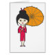 Ilustracion del dibujo animado de una señora del geisha. Ella está llevando un kimono de las rosas fuertes, deslizadores rosados y una sombra de ojos verde. Su pelo negro está para arriba en un bollo y ella está llevando un paraguas/un parasol.