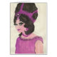 Dibuje a lápiz el bosquejo de una mujer de los años 60, watercolored con un vestido púrpura rosáceo, los pendientes, el collar y la cinta corriendo a través de su pelo.