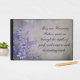 Sentimientos conmemorativos del libro de visitas funerarias con flores moradas y azules y acentos rosa. Los sentimientos dicen: Que nuestro Padre Celestial nos guíe a través de las profundidades del dolor y nos envuelva con su toque curativo.