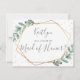 Esta tarjeta superlinda es la manera perfecta de preguntar "¿será mi criada de honor?". El diseño presenta un marco geométrico de Relieve metalizado dorado de moda, con una redacción de tipografía moderna y un exuberante eucalipto de color de agua. Estas tarjetas son fáciles de personalizar y se pueden usar para pedirle a sus seres queridos que sean su dama de honor, sirvienta o matrona, chica de flores, etc.