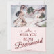 ¿Serás mi dama de honor? Tres damas de honor tendidas con ramos de trajes rosas y suaves delante de una ventana. El texto de fondo se puede ajustar en la plantilla. Foto de Valerie Elash