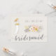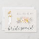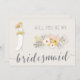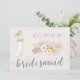 Serás mi tarjeta de dama de honor con chica rubio vestido de boda blanco, hermoso ramo de flores rosadas y texto gris personalizado, donde puedes agregar tu nombre y el de las damas de honor