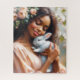 This oil painting portrait style artwork features a beautiful young Black woman tenderly embracing a soft white bunny. With blush-toned floral blooms woven into her flowing hair and a dreamy smile on her face, the image evokes feelings of love, peace, and springtime renewal. Perfect as Easter or a whimsical gift, this piece radiates softness and serenity with painterly textures and pastel hues. Ideal for lovers of animals, nature, and feminine elegance.