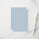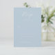Esta elegante tarjeta de respuesta para bodas presenta un diseño minimalista con un suave fondo azul pastel y texto blanco crujiente. La disposición está centrada, creando una apariencia equilibrada y armoniosa, perfecta para ocasiones formales. Con fuentes limpias sans-serif y una elegante escritura cursiva para enfatizar, la tarjeta emana sofisticación y claridad. Su ambiente sereno e invitador la hace ideal para capturar las respuestas de los invitados con gracia y simplicidad.