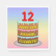 Este colorido y alegre diseño de servilletas de papel temático de cumpleaños presenta una representación al estilo personalizado de una torta de cumpleaños de tres niveles con velas en forma de número en la parte superior que muestran la edad "12", junto con el mensaje "FELIZ DÍA DE NACIMIENTO 12", y un nombre de destinatario de personalizable. El fondo presenta un diseño de gradiente inspirado en el espectro de colores pastel. Las servilletas de papel con temas de cumpleaños divertidos como estas podrían ser usadas en una fiesta de cumpleaños para celebrar el 12º cumpleaños de alguien. [~Z0000623]