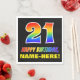 Este alegre, divertido y colorido diseño de servilletas de papel de cumpleaños presenta un gran número "21" y el mensaje "FELIZ CUMPLEAÑOS", ambos con un colorante inspirado en el gradiente del espectro del arcoiris, junto con un nombre de receptor negrita amarillo personalizado. El fondo es negro de color. Las servilletas de papel con temas de cumpleaños como esta pueden ser divertidas de usar en un fiesta que se celebra el cumpleaños 21 de alguien. [~Z0000476]