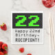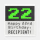 Este divertido y nerd diseño de servilletas de papel con temática de cumpleaños presenta un gran estilo de videojuegos verde "22" en un fondo de color negro. También incluye el mensaje de bienvenida de cumpleaños "Feliz cumpleaños número 22", y un nombre personalizado. Las servilletas de papel divertidas como esta podrían ser usadas en un fiesta que se celebra el 22 aniversario de un historiador de computación, un ingeniero o alguien que aprecia el videojuego. [~Z0000404]