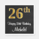 Este sofisticado, elegante y elegante diseño de servilletas de papel con temática de cumpleaños presenta un gran número ordinal "26th" con un aspecto imitación/falso de oro, junto con el mensaje de bienvenida de cumpleaños "Feliz cumpleaños 26", y un nombre personalizado con un tipo de letra estilo script. El fondo es negro de color. Las servilletas de papel con temas de cumpleaños como esta pueden ser divertidas de usar en una fiesta de cumpleaños que se celebra para alguien que está celebrando su vigésimo sexto cumpleaños. [~Z0000516]