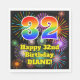 Este alegre y divertido diseño de servilletas de papel de cumpleaños presenta un gran número "32" con un colorido patrón inspirado en el gradiente del espectro del arco iris. También incluye el mensaje "Feliz cumpleaños número 32", y un nombre editable. El fondo presenta un patrón vibrante y colorido inspirado en la apariencia de fuegos artificiales de celebración reventados. Las servilletas de papel como esta podrían ser usadas en un fiesta realizado en celebración del 32 cumpleaños de alguien. [~Z0000574]