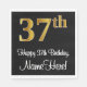 Este elegante, lujoso y sofisticado diseño de servilletas de papel de cumpleaños presenta un gran número ordinal "37th" que tiene un patrón de gradiente tipo oro falso/imitación, además del mensaje de bienvenida de cumpleaños "Feliz cumpleaños número 37", y un nombre editable en un tipo de letra estilo script. El fondo es negro de color. Las servilletas de papel como esta podrían ser usadas en una fiesta de cumpleaños realizada para celebrar el cumpleaños número treinta y siete de alguien. [~Z0000516]