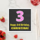 Este alegre y divertido diseño de pañuelos de papel con temática de cumpleaños presenta un gran número "3" con un patrón de rayas rosa oscuro y rosa claro que contiene formas cardíacas. También incluye el mensaje de bienvenida de cumpleaños "Feliz tercer cumpleaños", y un nombre editable. Las servilletas de papel como esta pueden ser divertidas de usar en un fiesta que se celebra el tercer cumpleaños de alguien. [~Z0000436]