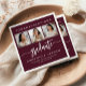 Celebra el hito de tu graduación con estilo con estas servilletas de graduación, que incluyen un collage de tres fotos cuadradas con la palabra "felicitaciones" en la parte superior y la palabra "graduados" en elegante escritura de caligrafía blanca con un fondo rojo borgoña. Personalízalo con el nombre de tu graduado, la escuela y el año de graduación en sans blancos serif.