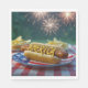 A hot dog with the word 'America' written in mustard rests on a star-spangled plate as fireworks light up the night sky in the background