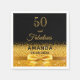Elegante, clásico, glamuroso y femenino servilleta para una fiesta de cumpleaños número 50. Una cinta dorada y un arco con purpurina dorado y brillo, un poco ostentoso y lujoso. Fondo negro. Con el texto: 50 y Fabulous. Plantillas de nombre y fecha.
