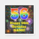 Este alegre y divertido diseño de servilletas de papel temático para cumpleaños presenta un gran número "56" con un colorido patrón inspirado en el gradiente del espectro del arcoiris, junto con el mensaje "Feliz cumpleaños número 56", y un nombre personalizado. El fondo presenta un patrón multicolor inspirado en la apariencia de los fuegos artificiales de celebración. Las servilletas de papel como esta podrían ser usadas en una fiesta de cumpleaños para alguien que está celebrando su cincuenta sexto cumpleaños. [~Z0000574]