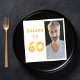 Una servilleta para una fiesta de cumpleaños número 60. Plantilla para tu foto. Antecedentes blancos y el texto: Saludos a los 60. El texto está escrito con un moderno guión en globo de oro falso.