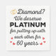 Diseño divertido, perfecto para todo aquel que haya estado casado durante 60 años y para una ceremonia de renovación de la promesa boda. ¡Es un gran conjunto para las parejas! 'Diamante? Merecemos Platinum por aguantarse la cita de 60 años para una pareja que se casó hace 60 años o una pareja que renueva los votos bodas en su aniversario de diamantes. ¿Eres un marido o una mujer romántica? ¡Acentúa tu estilo con este arte! Gran regalo para tu amigo que se casó hace 60 años, esposo o esposa de 60 años, o papá y mamá celebrando su 60 aniversario de boda.
