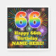 Este divertido y emocionante diseño de pañuelos de papel de cumpleaños presenta un gran número de "66" con un colorido patrón inspirado en el gradiente del espectro del arco iris. También incluye el mensaje "Feliz cumpleaños número 66", y un nombre personalizado. El fondo presenta un patrón emocionante y colorido inspirado en el aspecto de los fuegos artificiales de celebración que reventan. Las coloridas toallas de papel con tema de cumpleaños como esta podrían ser usadas en un fiesta para celebrar el cumpleaños 66 de alguien. [~Z0000574]