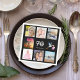 Una servilleta para una fiesta de cumpleaños número 70, celebrando su vida con un collage de 8 de sus fotos. Plantillas para un nombre, edad 70 y fecha. Fecha de nacimiento o fecha del fiesta. Letras de color blanco y gris. Fondo negro.