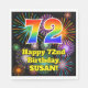 Este alegre y excitante diseño de la servilleta de papel de cumpleaños presenta un gran número "72" con un colorido patrón inspirado en el gradiente del espectro del arco iris. También incluye el mensaje "Feliz cumpleaños número 72", y un nombre personalizado. El fondo presenta un patrón vibrante y colorido inspirado en la apariencia de fuegos artificiales de celebración reventados. Las servilletas de papel como esta podrían ser usadas en una fiesta de cumpleaños realizada para celebrar el 72 cumpleaños de alguien. [~Z0000574]