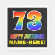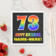 Este colorido, divertido y alegre diseño de servilletas de papel temático para el cumpleaños incluye un gran número de "73" y el mensaje "FELIZ CUMPLEAÑOS", ambos coloreados con un patrón inspirado en el gradiente del espectro del arcoiris, junto con un audaz nombre de destinatario personalizado amarillo. El fondo es negro de color. Divertidas, servilletas de papel de personalizable como esta podrían ser usadas en un fiesta que se celebra el cumpleaños setenta y tres de alguien. [~Z0000476]