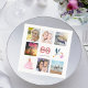 Una servilleta para una fiesta de cumpleaños número 80, celebrando su vida con un collage de 8 de sus fotos. Plantillas para un nombre, edad 80 y fecha. Fecha de nacimiento o fecha del fiesta. Cartas de color coral y burdeos. Fondo blanco.