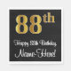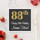 Este elegante, sofisticado y lujoso diseño de servilletas de papel temático para cumpleaños presenta un gran número ordinal "88th" con un aspecto falso/imitación de oro, además del mensaje de bienvenida de cumpleaños "Feliz cumpleaños número 88", y un nombre de personalizable con un tipo de letra estilo script. El fondo es negro de color. Las servilletas de papel como esta podrían ser usadas en un fiesta para alguien que está celebrando su ochenta y ocho cumpleaños. [~Z0000516]