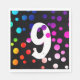 Patrón neon rainbow dot sobre fondo negro para la fiesta de cumpleaños número 9. La edad puede ser editada. Se puede cambiar el color de fondo negro.