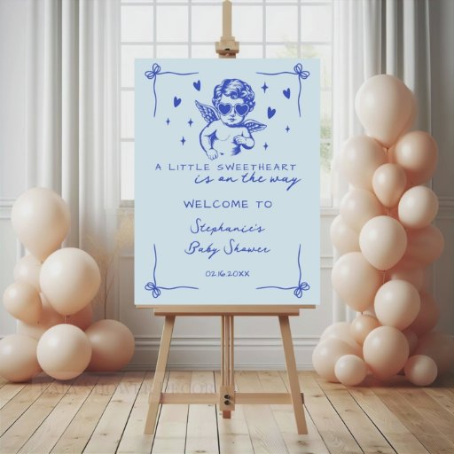 Add a sweet and meaningful touch to your celebration with these A Little Sweetheart Is on the Way personalized baby shower napkins, designed to bring romantic charm and thoughtful detail to your table décor. Featuring an adorable vintage-inspired cupid illustration with heart sunglasses, delicate floating hearts, and a soft baby blue background, these napkins perfectly capture a Valentine’s-inspired sweetheart theme with a timeless, coquette feel.