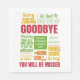 Di adiós con estilo. Este fabuloso diseño tipográfico presenta varios mensajes de despedida. Una servilleta maravillosa para enviar tus mejores deseos y decorar una mesa fiesta. Sería perfecto para que un empleado o un colega de trabajo dejara el fiesta. Se puede personalizar con un mensaje corto.