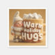A charming and sweet 3D render or miniature photograph featuring an adorable, fluffy beige felt gnome standing next to a large, textured fabric mug. The gnome has a large white beard, pink cheeks, and a beige knitted hat. The oversized mug is labeled with the message "Warm Holiday Hugs" in white, marshmallow-like letters, and is overflowing with soft white marshmallows. The scene is set against a warm, soft ochre background, emphasizing the cozy, comforting, and whimsical nature of the image.