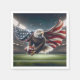 Un águila calva que aferra a un fútbol aparece de forma destacada, envuelta en una bandera estadounidense, sobre un estadio de fútbol bien iluminado.
