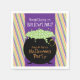 Esta servilleta de la fiesta de Halloween incluye una olla de bruja negra de sopa de burbujas verdes. El fondo es violeta, con rayas de colores vivos verdes, naranjas y violetas. El texto del personalizable dice: ¡Algo se está rompiendo! ¡Fiesta de Halloween!
