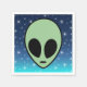Una cabeza de alienígena verde con grandes ojos ovalados negros y una pequeña ranura negra a modo de boca. El fondo es un color gradiente de azul oscuro a claro salpicado de estrellas blancas.