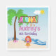 Playa Tropical de Luau cumpleaños servilletas de papel personalizadas, con chica hula, palmera y escena de playa, con texto fácil de personalizar.