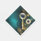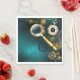 Una lupa antigua con mango dorado y lente convexa sobre el fondo verde con los engranajes dorados y un reloj antiguo. Estilo Steampunk.