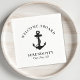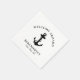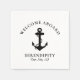 Modernas toallas de papel de temática náutica para tu barco que incluyen un ilustracion de ancla negra y "Welcome Aboard" y el nombre y ubicación de tu barco en una tipografía y escritura elegantes.