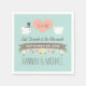 Bonito ama al pájaro y dove diseño boda temático con dos palomas blancas, una con un sombrero de novio gris y otra con un velo de novia floral sobre un fondo azul acuático. Las iniciales de la novia y del novio se pueden añadir al corazón rosado. El texto de la pancarta marrón dice Beber y estar casado, pero puedes personalizar que diga lo que quieras. Añada la fecha de su boda al diseño de la bandera de la cinta. Las flores blancas en las ramas de los árboles, los corazones de color coral, las flores rosadas y marrones y el diseño de rosa y tulipán amarillos componen la corona laurel. Añada los nombres de la novia y del novio al final de la servilleta de papel. Pintura © Chrissy H. Studios, LLC. Todos Los Derechos Reservados.