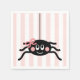 Una adorable araña con mejillas rosadas lleva una cinta linda y giratoria atada en un arco y cuelga de la parte superior de un fondo con estribos rosados y blancos. Igualmente adorable para una fiesta de cumpleaños con temática de araña amarga de Halloween o Itsy. Pintura © Chrissy H. Studios, LLC. Todos Los Derechos Reservados.
