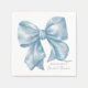 Un encantador diseño de servilleta de cóctel que presenta un gran lazo azul de acuarela en un ángulo lindo en el centro. El nombre de la futura novia se muestra en una fuente serif clásica en la esquina inferior derecha, con "Desayuno de Novia" escrito elegantemente debajo en caligrafía manuscrita. Perfecto para un tema atemporal de "Ella está atando el nudo" o una dulce celebración de "Algo azul antes de que diga 'Sí'".